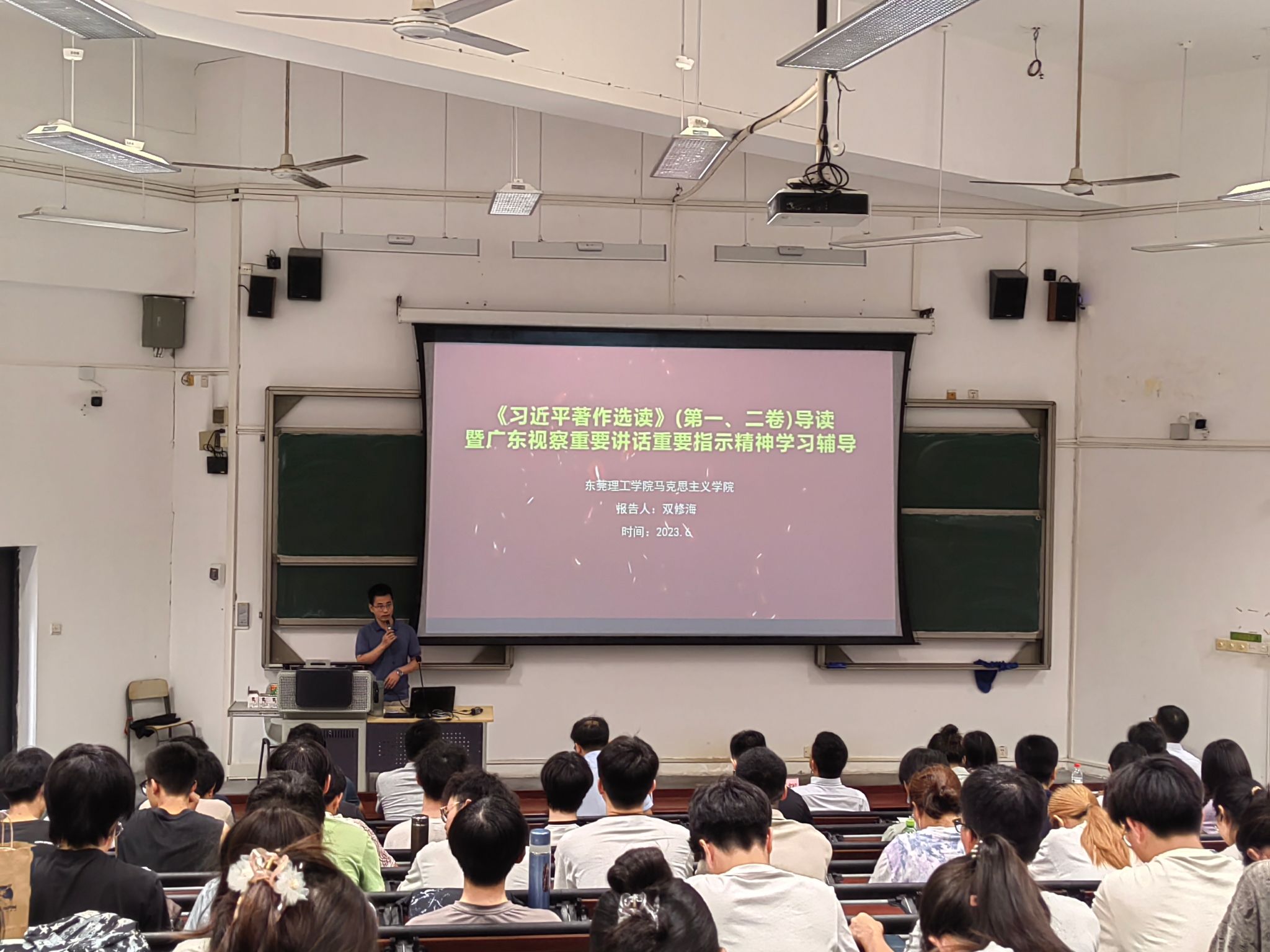 党委召开全院师生大会,邀请马克思主义学院双修海老师进行学习贯彻《习近平著作选读》第一卷、第二卷专题宣讲暨学习贯彻习近平总书记视察广东重要讲话重要指示精神专题辅导,学院领导和全体师生200余人参加了学习。