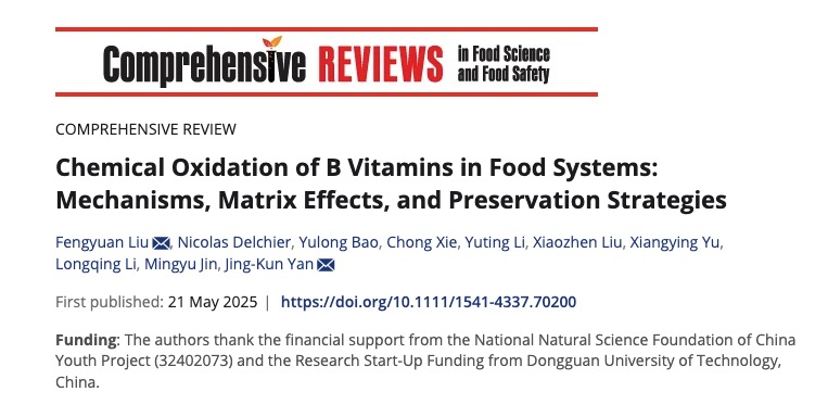 刘丰源博士在国际食品顶级期刊《Comprehensive Review of Food Science and Food Safety》在线发表题为“Chemical Oxidation of B Vitamins in Food Systems: Mechanisms, Matrix Effects, and Preservation Strategies”综述文章。刘丰源助理研究员为论文的第一作者,闫景坤教授为通讯作者。