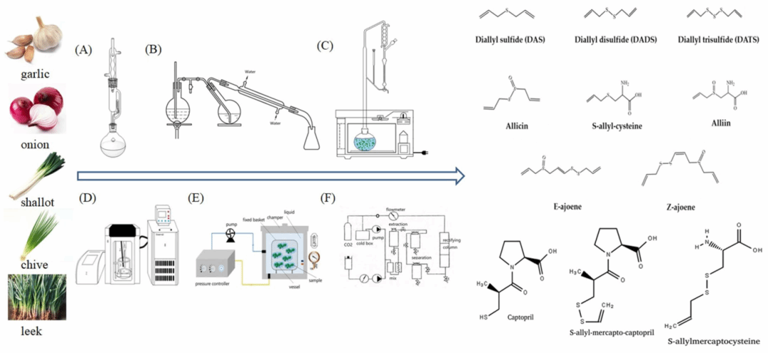 图 2 葱属植物中有机硫化物的提取方法: (A) 溶剂提取法; (B) 蒸汽蒸馏法; (C) 微波法; (D) 超声波法; (E) 超高压提取法; (F) 超临界 CO2法