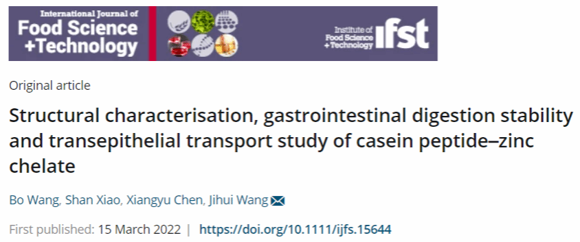 化学工程与能源技术学院王波博士(第一作者)在国际食品期刊《International Journal of Food Science and Technology》(IF:3.612, 中科院二区)发表了题为“Structural characterisation, gastrointestinal digestion stability and transepithe-lial transport study of casein peptide–zinc chelate”的研究论文。