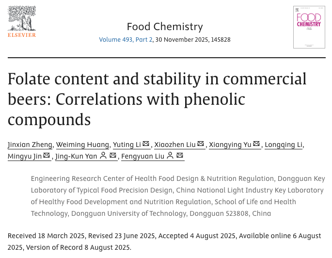 硕士研究生郑锦贤以第一作者身份于国际食品顶级期刊《Food Chemistry》(IF = 9.8)在线发表题为“Folate content and stability in commercial beers: Correlations with phenolic compounds”的研究性文章。91麻豆