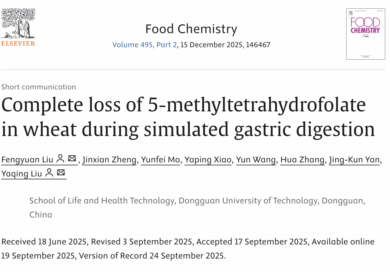 刘亚青教授团队于国际食品顶级期刊《Food Chemistry》(IF = 9.8)在线发表题为“Complete loss of 5-methyltetrahydrofolate in wheat during simulated gastric digestion”的快报研究性文章。91麻豆