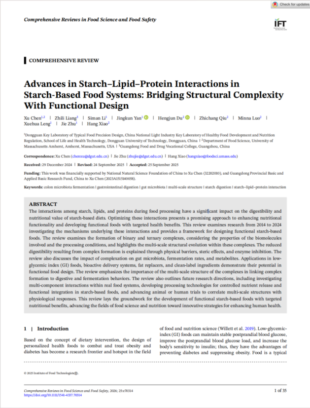 朱杰教授团队在国际食品Top期刊《Comprehensive Reviews in Food Science and Food Safety》(Q1,IF:14.1)发表题为“Advances in Starch–Lipid–Protein Interactions in Starch-Based Food Systems: Bridging Structural Complexity With Functional Design”的封面综述文章。陈旭副教授为论文第一作者和通讯作者,朱杰教授、肖航教授为共同通讯作者。该成果为陈旭副教授在美国马萨诸塞大学阿默斯特分校(UMass Amherst)访学交流期间的重要国际合作成果。