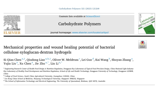 生物大分子构效与营养品质调控团队在国际化学顶级期刊《Carbohydrate Polymers》(Q1,IF= 11.2,)发表了题为“Mechanical properties and wound healing potential of bacterial cellulose-xyloglucan-dextran hydrogels”的研究论文。论文第一作者为陈思谦副教授,硕士研究生廖秋冬为共同第一作者,朱杰教授、李琳教授为通讯作者。