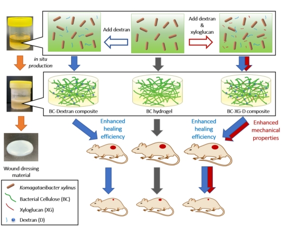 细菌纤维素-木葡聚糖-右旋糖酐复合水凝胶伤口敷料制备方法及效果概念图