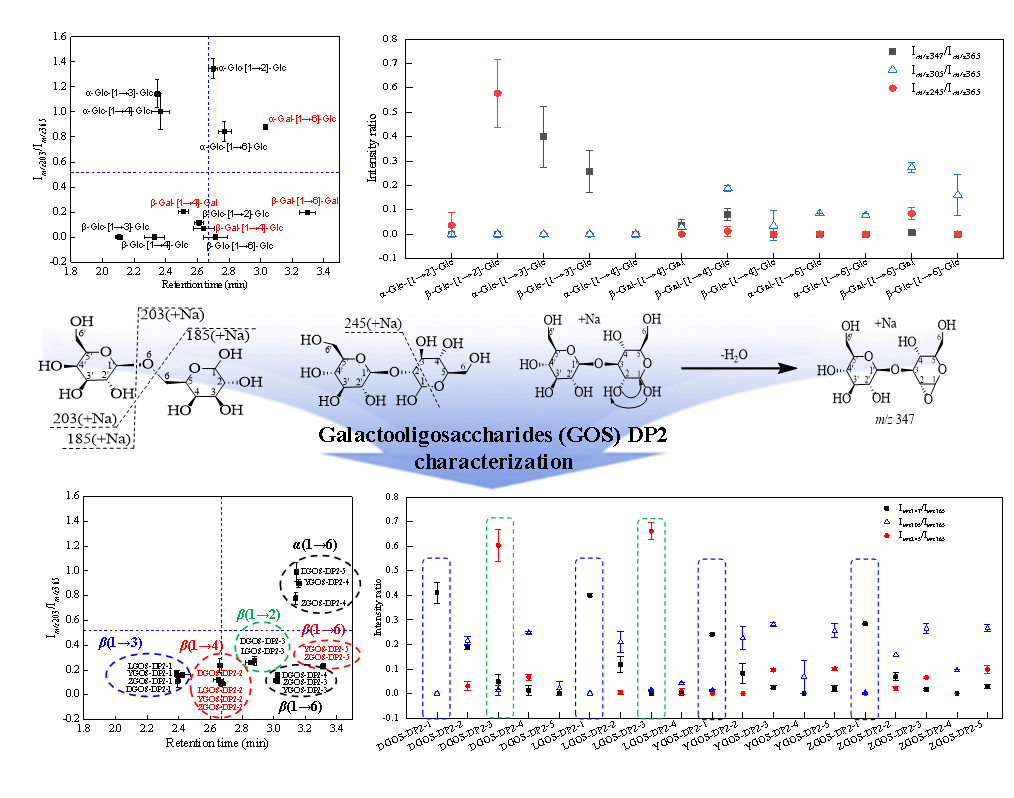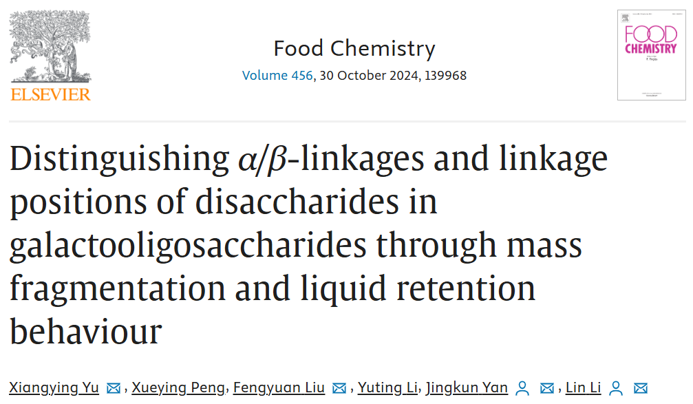 闫景坤教授团队于国际食品顶级期刊《Food Chemistry》在线发表题为“Distinguishing α/β-linkages and linkage positions of disaccharides in galactooligosaccharides through mass fragmentation and liquid retention behaviour”的研究性文章。论文第一作者为余祥英博士,通讯作者为闫景坤教授。
