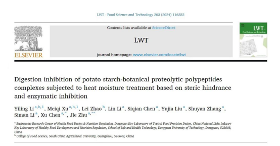 朱杰教授团队于国际食品顶级期刊《LWT-Food Science and Technology》(中科院一区Top期刊)在线发表题为“Digestion inhibition of potato starch-botanical proteolytic polypeptides complexes subjected to heat moisture treatment based on steric hindrance and enzymatic inhibition”的研究性文章。硕士研究生李益玲为第一作者、徐美琪为共同第一作者,朱杰教授和陈旭副教授为通讯作者。