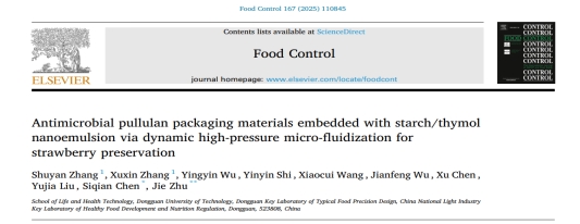 朱杰教授团队于国际食品顶级期刊《Food Control》(中科院一区Top期刊)在线发表题为“Antimicrobial pullulan packaging materials embedded with starch/thymol nanoemulsion via dynamic high-pressure micro-fluidization for strawberry preservation”的研究性文章。张书艳实验员为第一作者,硕士研究生张旭鑫为共同第一作者,朱杰教授为通讯作者。