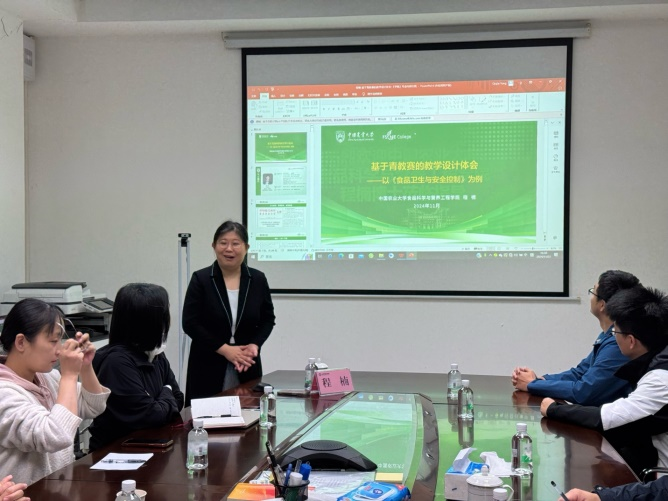 程楠博士结合自己参加青教赛的经历,分享了她对教学与科研融合的独特见解,为参会教师提供了一种全新的视角。她以《食品卫生与安全控制》课程为例,结合自身在生物传感以及食品中的纳米技术等相关领域的研究工作经历,分享了自己的日常教学设计经验和参加青教赛的备赛体会,并详细介绍了青教赛的评分要点。在互动环节,参会教师就教学重点的设置、课程内容的深度与广度、课程思政的融入等问题与程楠博士进行了深入交流探讨。