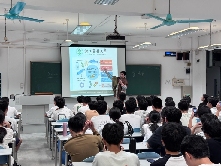 邀请浙江农林大学Rabia Durrani博士于10月29日为学院本科生讲授全英文课程《烹饪营养学》,并面向全校学生开设了题为《香榧功能性肽的营养调控与代谢干预》的科普讲座。