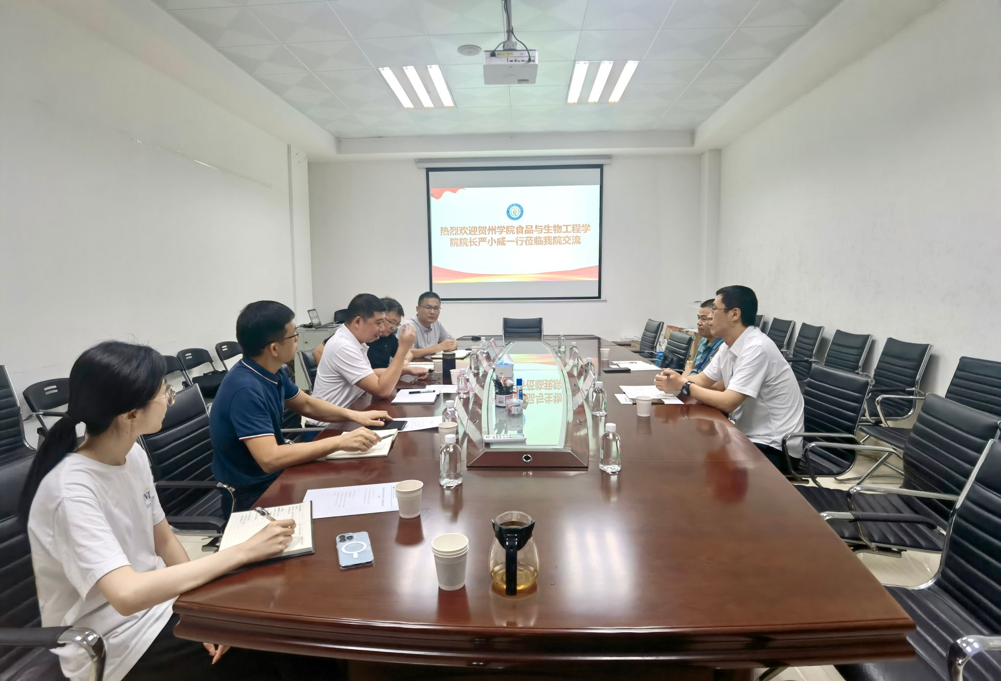 的热情接待表示感谢,并介绍了贺州学院食品与生物工程学院的历史沿革、学科建设、师资团队、教学场地及设备、院校合作等基本情况。韩春阳副院长着重介绍了当前学院教学管理、毕业生实习等方面的工作举措。交流环节中,双方围绕加强院系学科建设、开展硕士点培育与申报、深化校企合作、推进产学研融合、保障毕业生实习就业以及健全教师干部培养机制等内容进行了深入探讨和交流。