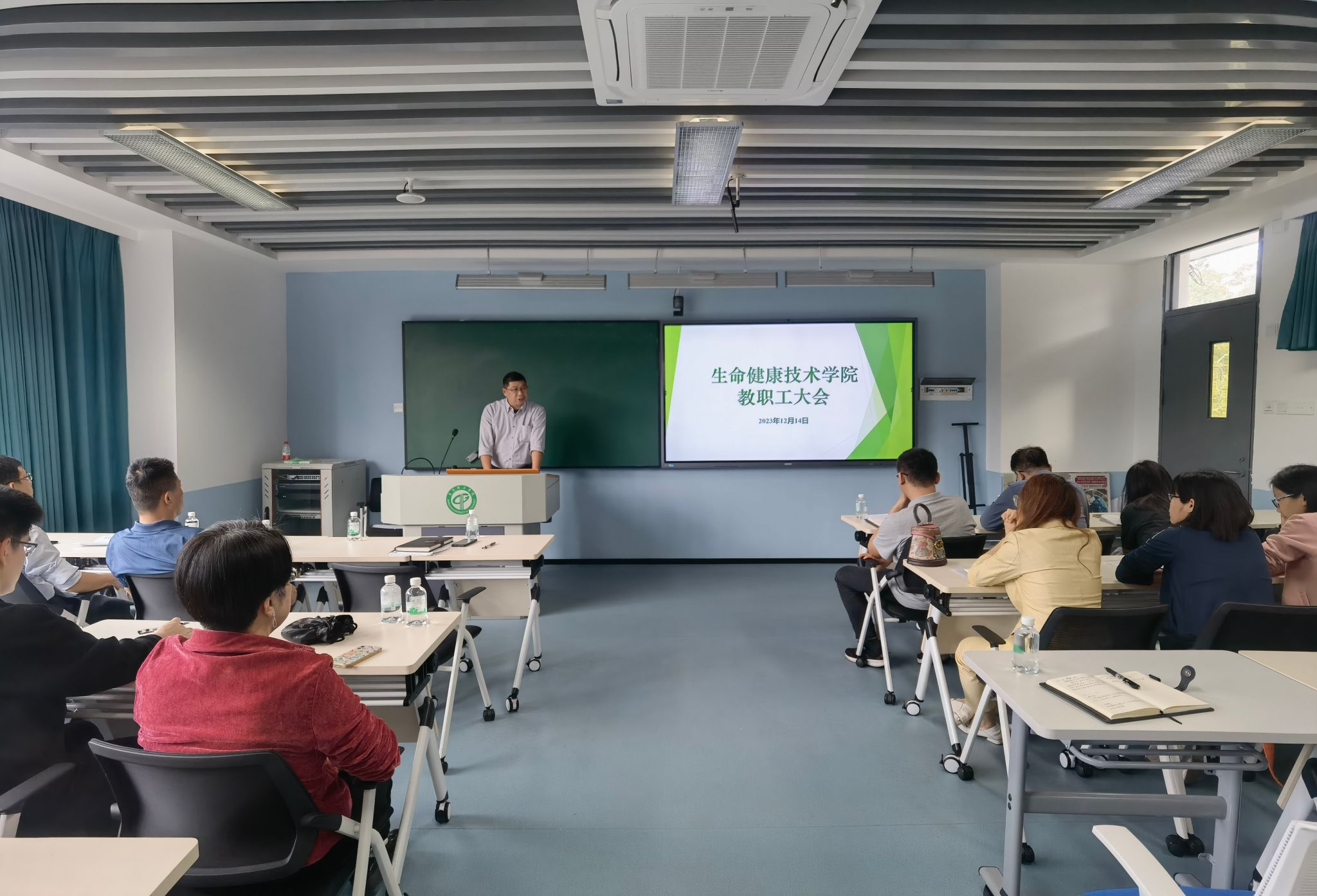 在教学楼6A-301召开全体教职工大会。学院全体领导班子成员及全院教职工参加本次会议,会议由学院党委书记谢炯标主持。